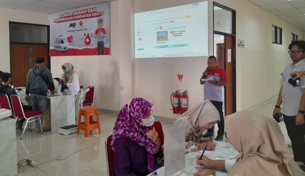 PURBALINGGA – Perusahaan pengiriman barang PT Tiki Jalur Nugraha Ekakurir (JNE) bekerjsama dengan RSUD dr. R. Goeteng Taroenadibrata Purbalingga menggelar donor darah dan pemeriksaan gratis, Sabtu (6/9/2025). Kegiatan ini merupakan, salah satu komiten JNE di bidang kemanusiaan.