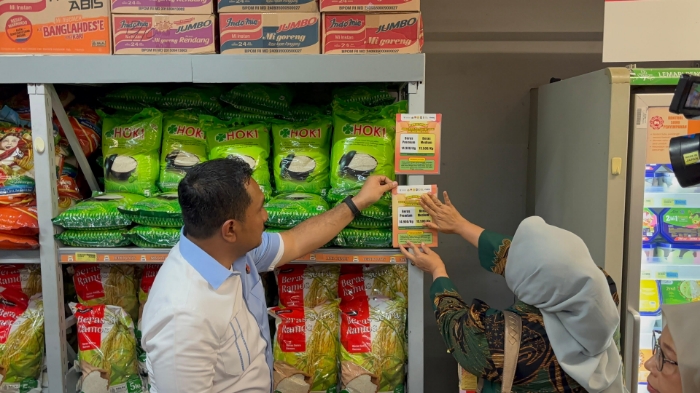 Di salah satu pertokoan modern di jalan Sukun Raya, Kota Semarang, tim menempelkan stiker HET beras sebagai bentuk edukasi sekaligus peringatan kepada pelaku usaha. HET beras ditetapkan sebesar Rp13.500 per kilogram untuk beras medium dan Rp14.900 per kilogram untuk beras premium.