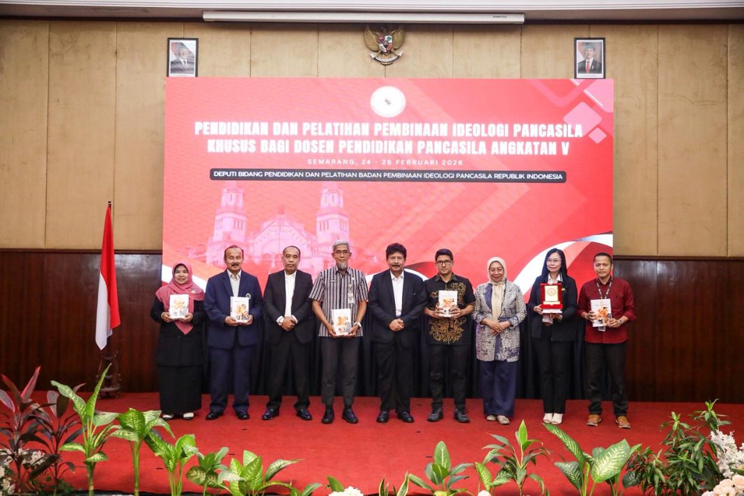 “Nilai ideologi Pancasila itu harus tertanam di teman-teman kita di mahasiswa,” tegas Sumarno saat acara Pembukaan Pendidikan dan Pelatihan Pembinaan Ideologi Pancasila Khusus Bagi Dosen Pendidikan Pancasila Angkatan V di Hotel Novotel Semarang pada Selasa, 24 Februari 2026.