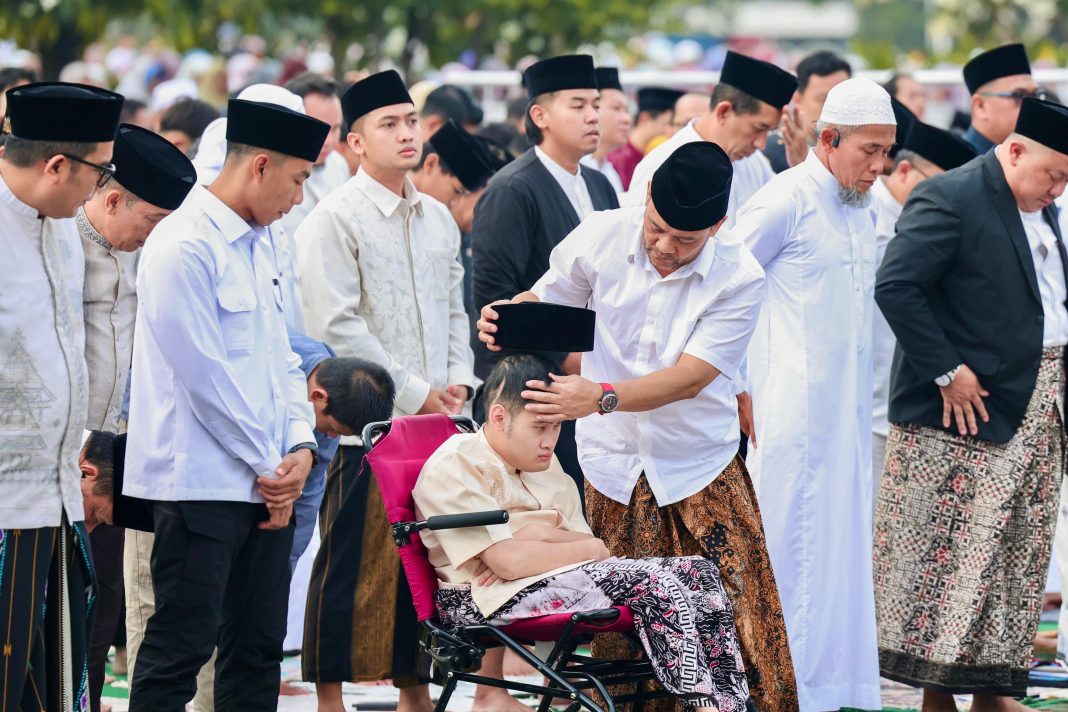 Ahmad Luthfi tiba di lokasi sekitar pukul 06.15 didampingi putra bungsunya, Mohammad Alif Daffa. Mengenakan baju putih dan peci hitam, ia tampak mendorong kursi roda putranya menuju lokasi salat, lalu menempati saf terdepan.